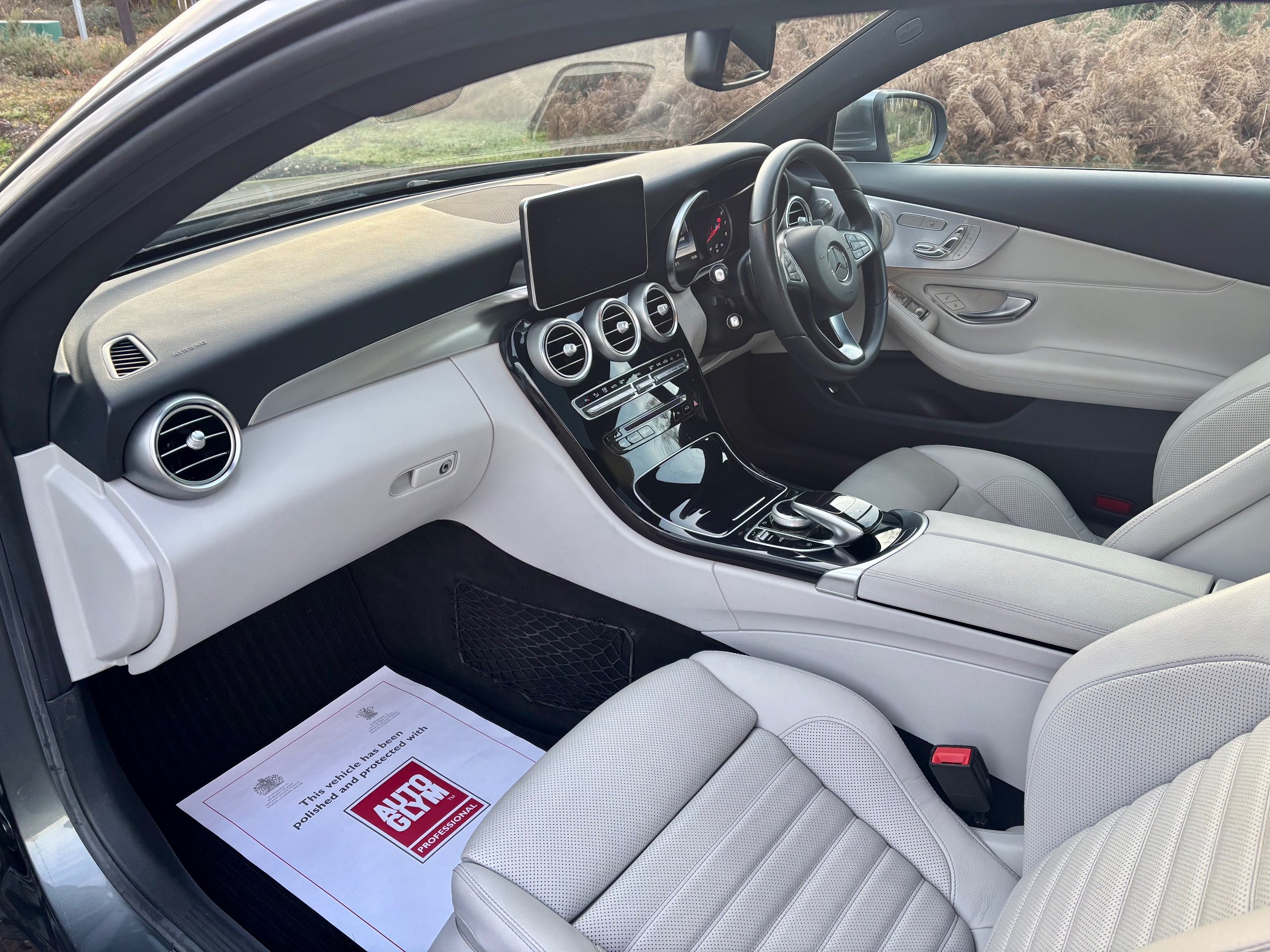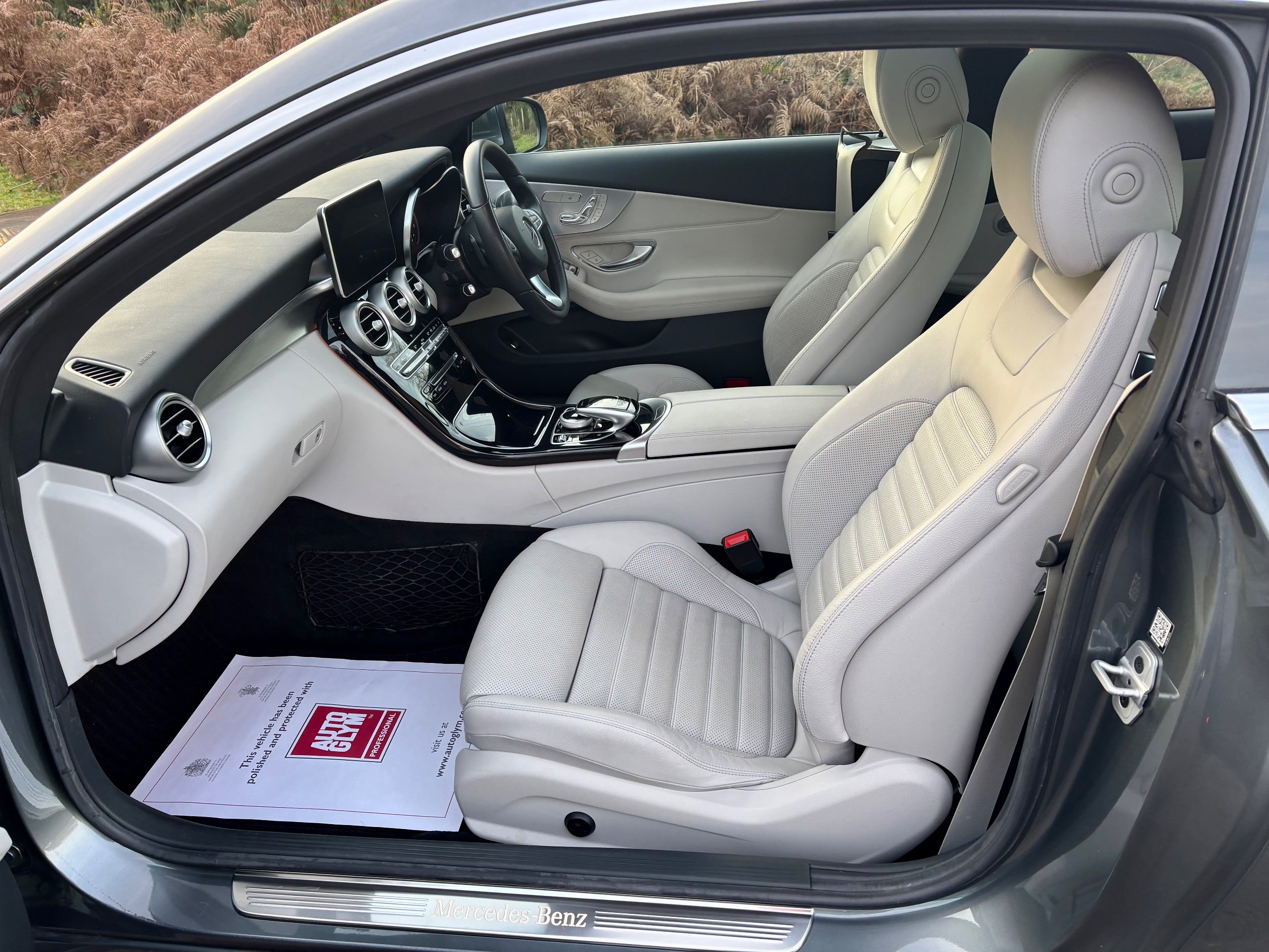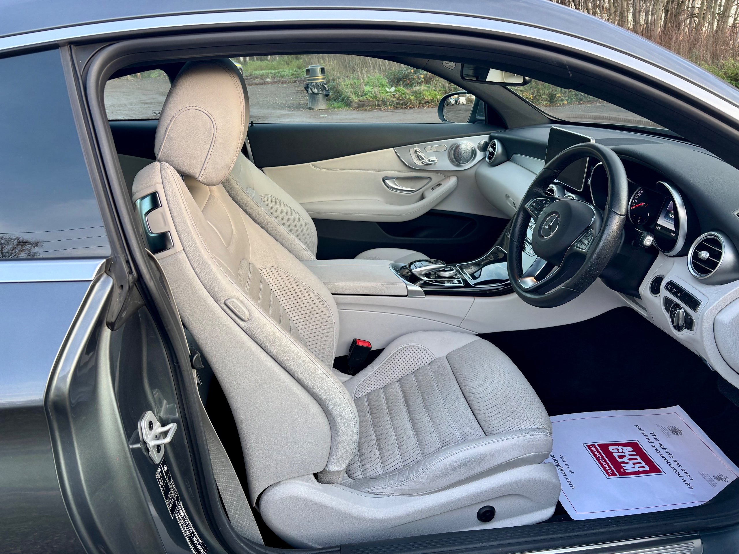 We are pleased to offer this stunning, Mercedes Benz C200 Sport Premium Plus 2.0 Automatic Coupe. It is finished in metallic selenite grey complemented with cream leather upholstery. This vehicle is supplied with Mercedes/ Specialist service history, MOT until 17/11/2026 and two keys. We offer a standard 6 month warranty which can be upgraded to a 24 month comprehensive warranty for only £495+VAT. Specification includes: Panoramic sliding sunroof, head up display, comand satellite navigation, electric heated front seats with memory package, park assist, bluetooth phone preparation, 360 camera, active brake assist system, cruise control, 9 speed automatic transmission, airmatic suspension, electric folding door mirrors, DAB radio with burmester surround system, air conditioning, electric windows, ambient lighting, LED headlights, automatic bootlid opening/closing feature, keyless go, 17" alloy wheels, folding rear seats, remote central door locking, alarm system, 4 matic all wheel drive, Eco stop/start system, AMG door sill panels, dual cup holder, multi function steering wheel. HPI cleared. Euro 6 technology. ULEZ COMPLIANT. NO ADDITIONAL ADMIN FEES. Part exchange welcome. Please read our 5 star Autotrader reviews. WE OPERATE BY APPOINTMENT ONLY. For further information or to arrange an appointment please call us on 07884367167.