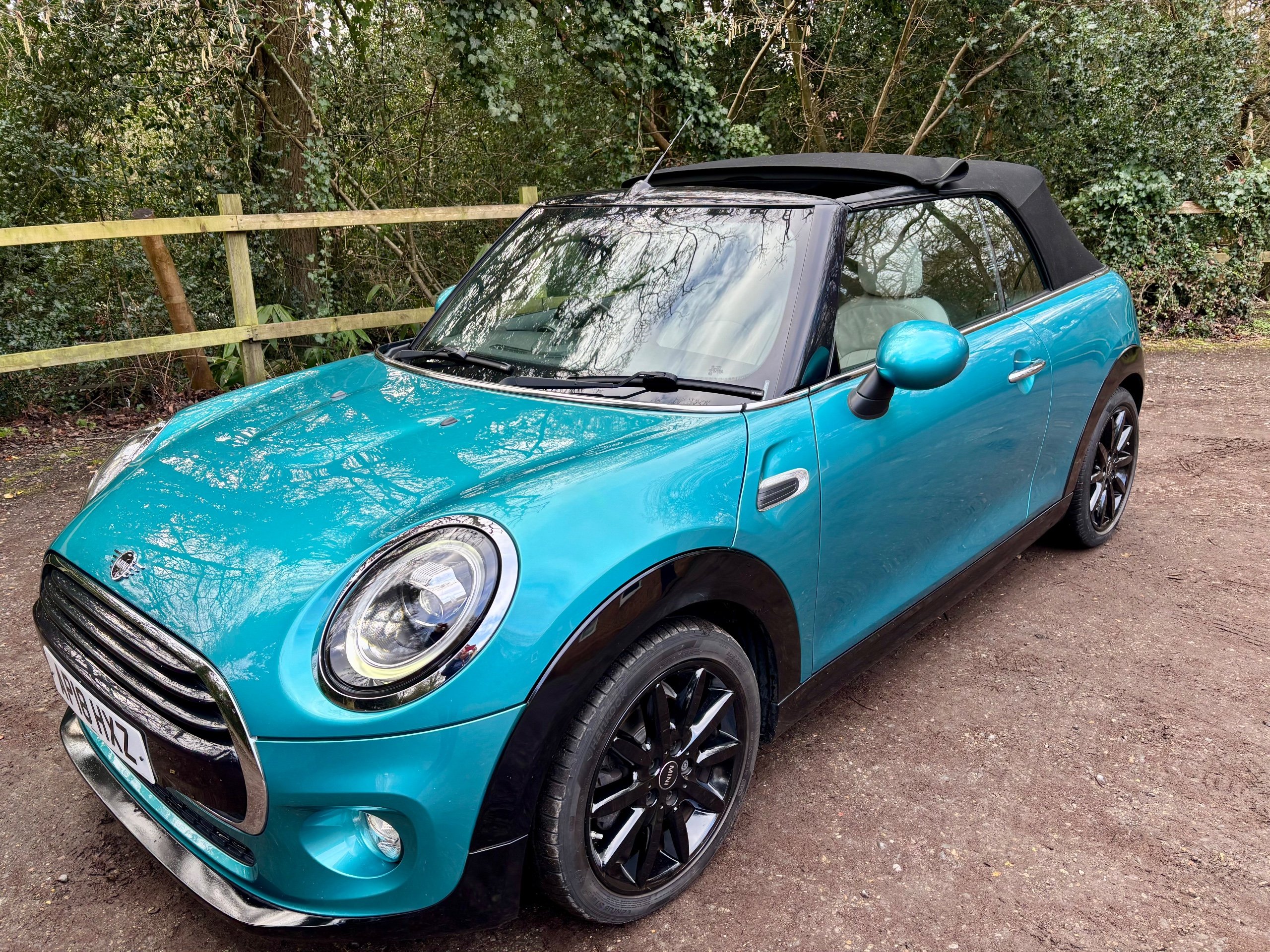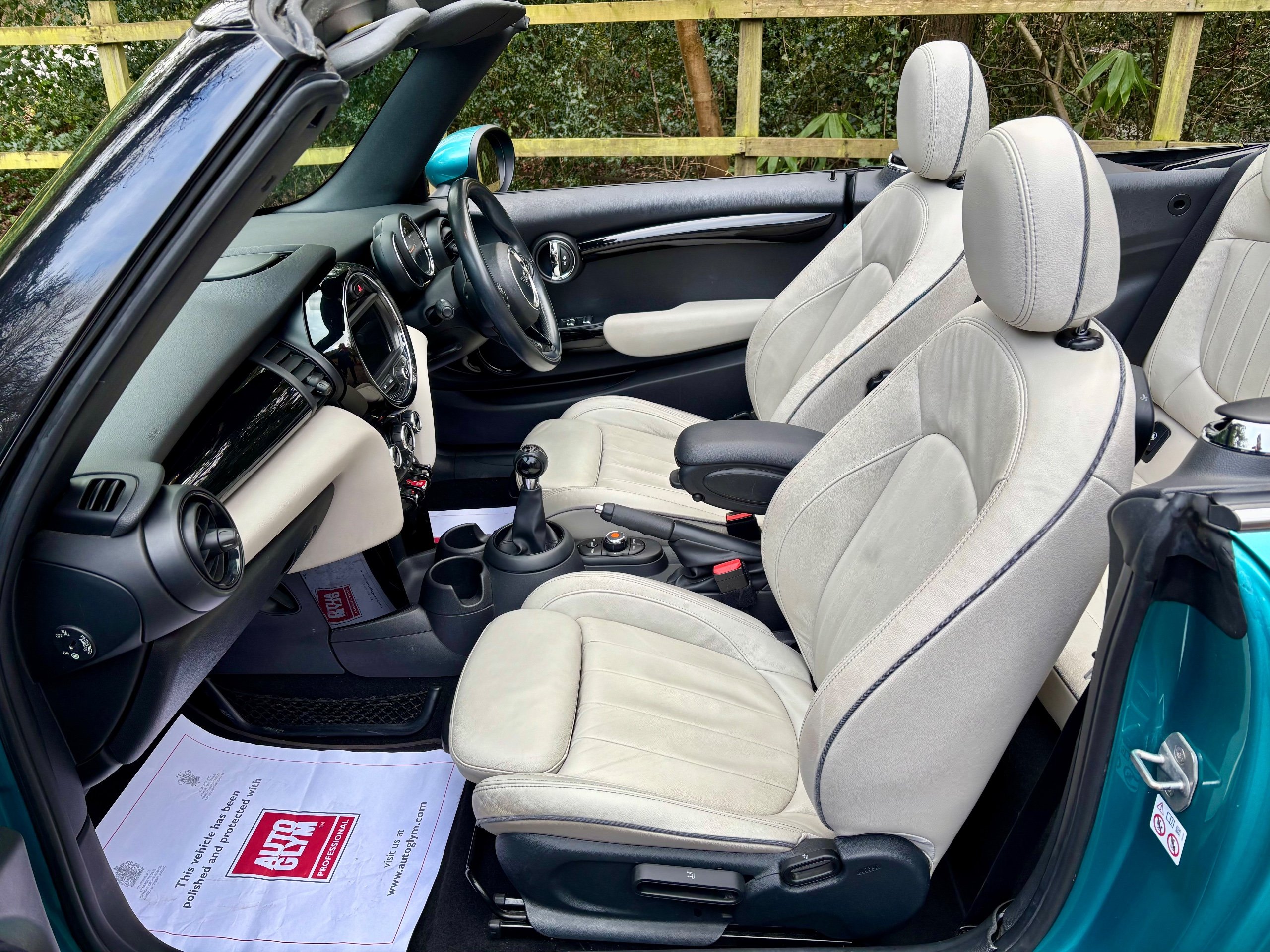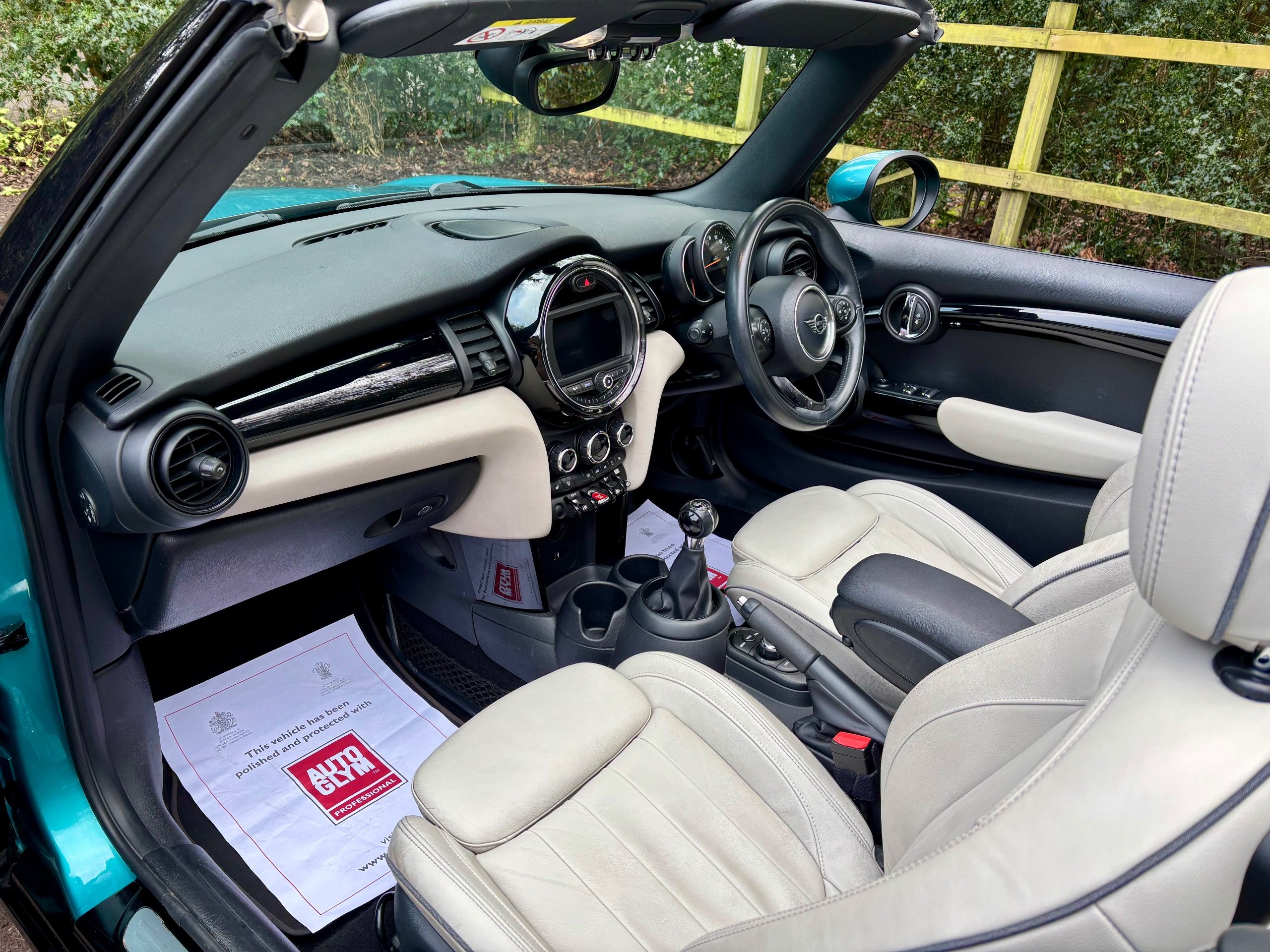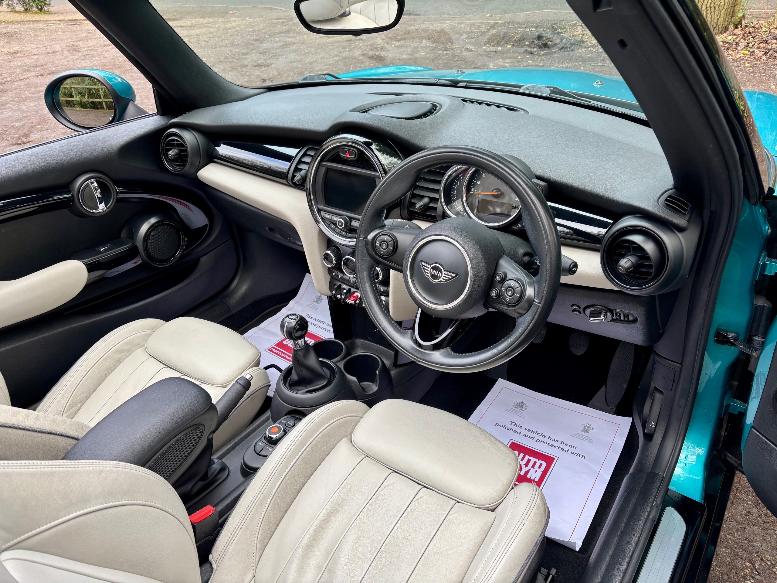 We are pleased to offer this stunning, Mini Cooper 1.5 convertible. It is finished in metallic Carribean - aqua complemented with satellite - grey leather upholstery. This vehicle is supplied with documented service history, MOT until 29/06/2026 and two keys. We offer a standard 6 month warranty which can be upgraded to a 24 month comprehensive warranty for only £495+VAT. Specification includes: Heated front sports seats, cruise control with brake function, rear parking sensors, air conditioning, bluetooth phone preparation, Mini excitement package, electric folding roof, electric windows, remote central door locking, front armrest, isofix system, light package, LED fog lights, chilli pack, LED headlights, DAB radio, sports leather steering wheel, 6 speed manual transmission, 17" pedal spoke alloy wheels, multi function steering wheel. Eco stop/start system. HPI cleared. Euro 6 technology. ULEZ COMPLIANT. NO ADDITIONAL ADMIN FEES. Part exchange welcome. Please read our 5 star Autotrader reviews. WE OPERATE BY APPOINTMENT ONLY. For further information or to arrange an appointment please call us on 07884367167.